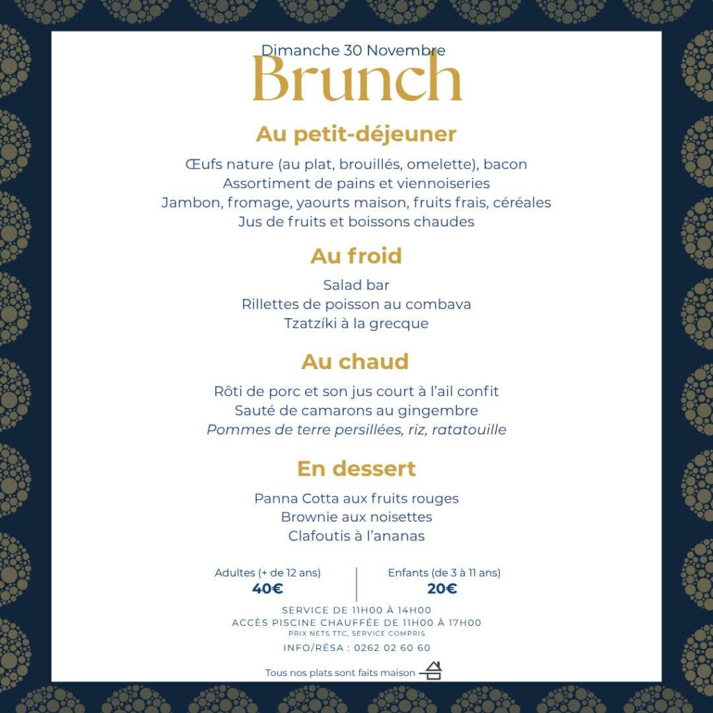 Laissez-vous tenter par un buffet généreux mêlant saveurs salées, douceurs sucrées et fruits frais, puis prolongez le plaisir en vous relaxant au bord de l’eau jusqu’à 17h.