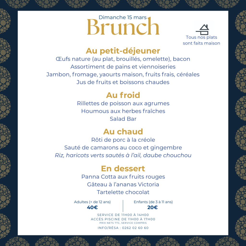 Le brunch est proposé à 40€ TTC par personne hors boissons (20€ TTC par enfant de 3 à 11 ans).