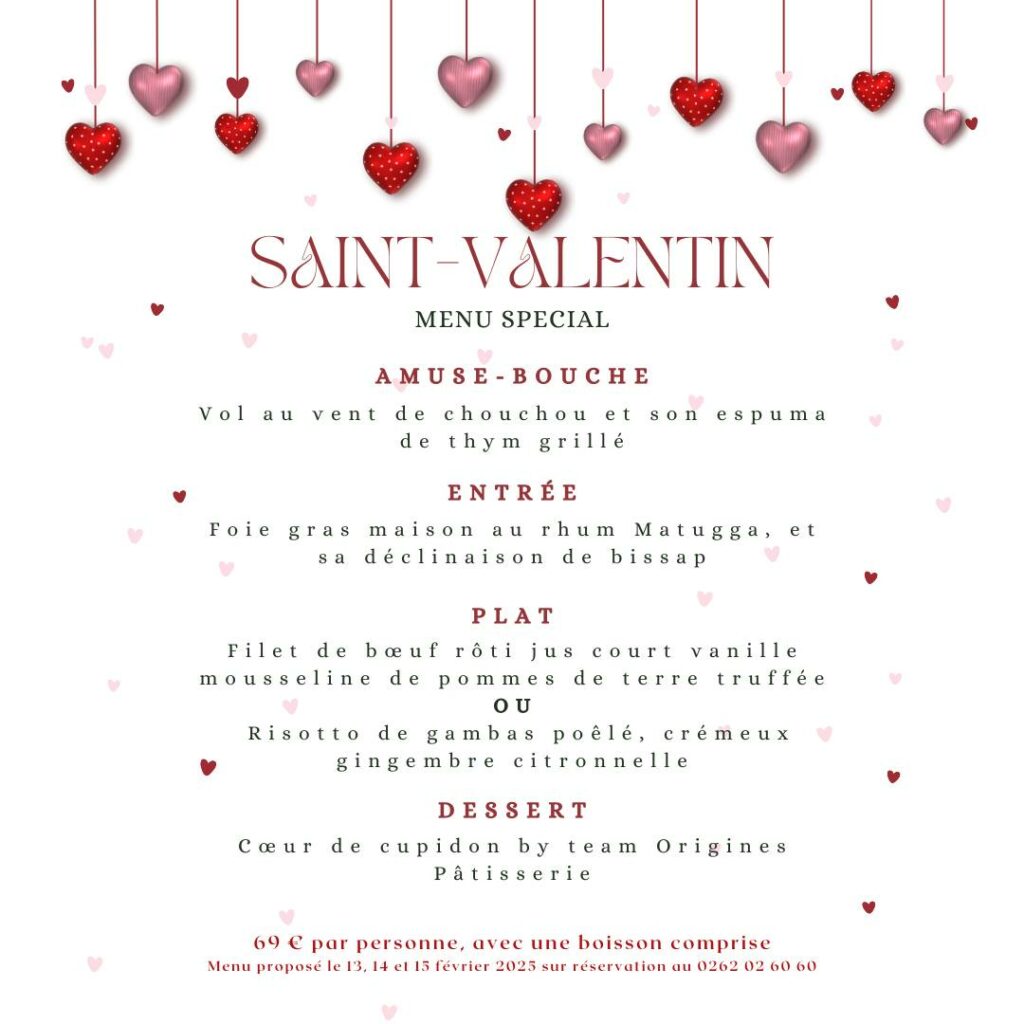 Que vous soyez en avance ou un peu en retard pour la fête des amoureux, l’équipe du Restaurant Le P’tit Bleu se fera un plaisir de vous accueillir. Découvrez notre menu ci-dessous et 𝗿𝗲́𝘀𝗲𝗿𝘃𝗲𝘇 𝘃𝗼𝘁𝗿𝗲 𝘁𝗮𝗯𝗹𝗲 𝗱𝗲̀𝘀 𝗺𝗮𝗶𝗻𝘁𝗲𝗻𝗮𝗻𝘁 au 0262 02 60 60 !