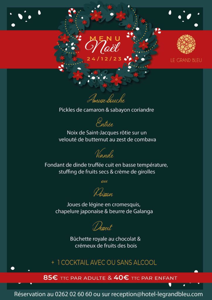 Le 24, laissez-vous enchanter par notre menu réveillon de Noël, une symphonie de saveurs pour une soirée inoubliable.