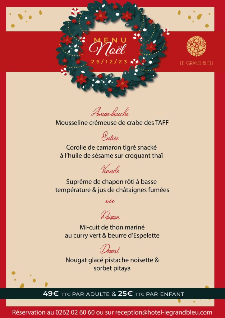 Menu proposé le 25 décembre 2023 au tarif de 49€ TTC par adulte et 25€ TTC par enfant (3 ans à moins de 12 ans)