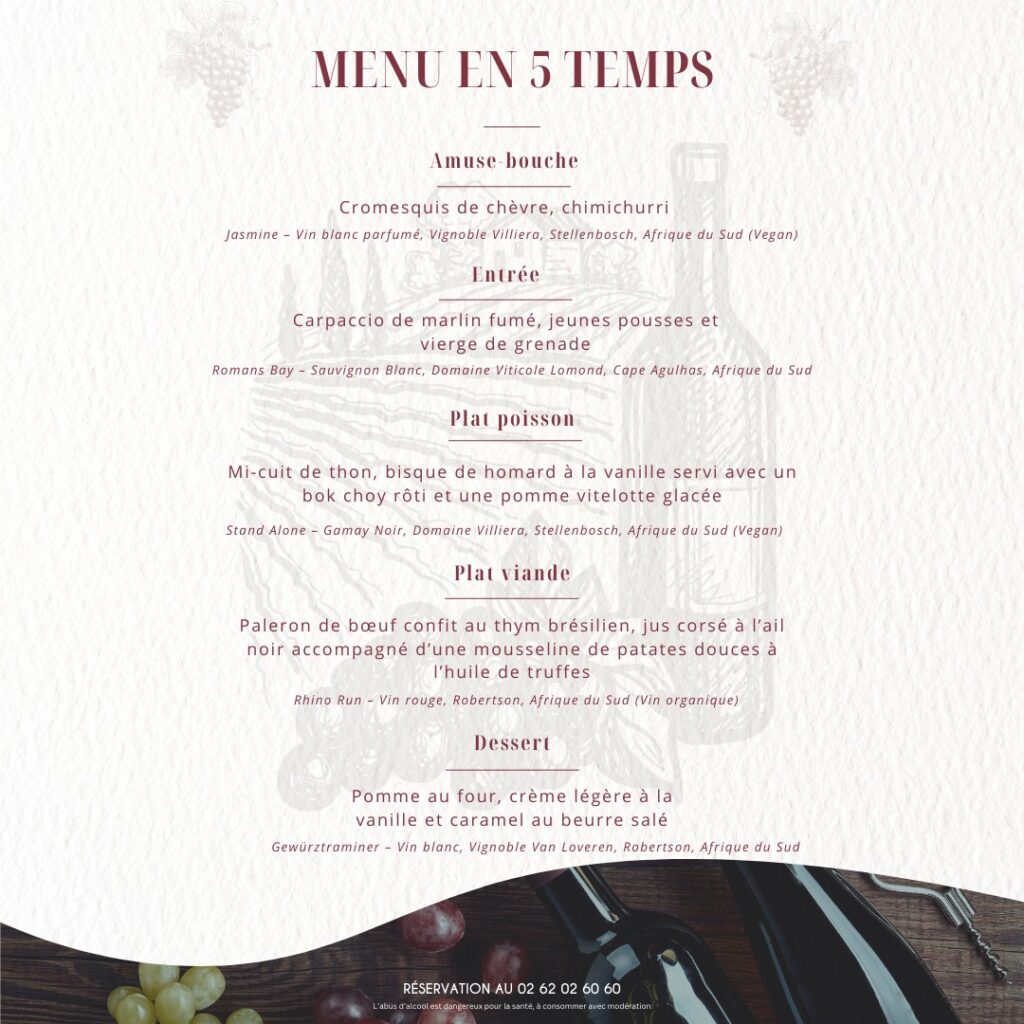 Un moment gustatif qui révèlera l’élégance et la richesse des vins sud-africains. Réservez votre table dès maintenant au 02 62 02 60 60 et laissez-vous transporter !