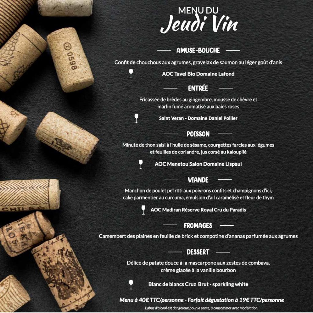 Dans le respect des accords mets-vins nous vous proposons un menu dégustation « amuse bouche, entrée, poisson, viande, fromages, dessert » (40€ TTC par personne) accompagné de ses 5 verres de vin (8 cl) (forfait dégustation 19€ TTC par personne)